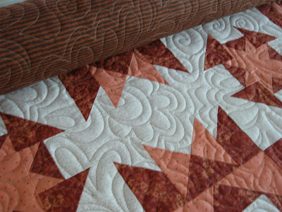 My Job: Sandwich all three layers with my free motion stitching. You can see here that I used my "freeform feather" design on this quilt.